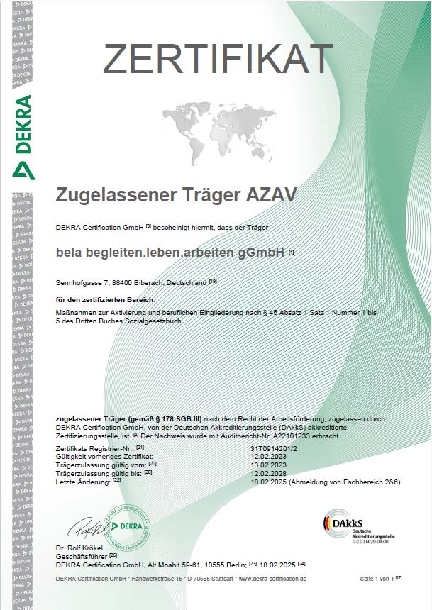bela begleiten.leben.arbeiten gGmbH – Fachdienst ARBEIT – ist ein zugelassener Träger nach der „Akkkreditierungs- und Zulassungsverordnung Arbeitsförderung“, kurz AZAV. Die Zertifizierungsstelle DEKRA Certification GmbH sprach dem Fachdienst ARBEIT die Zulassung zur Durchführung von Maßnahmen zur Aktivierung und beruflichen Eingliederung sowie der Arbeitsvermittlung aus. Ein besonderes Augenmerk gilt den Maßnahmen zur Teilhabe behinderter Menschen am Arbeitsleben.